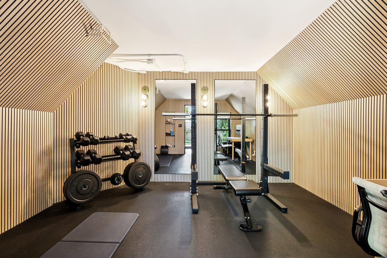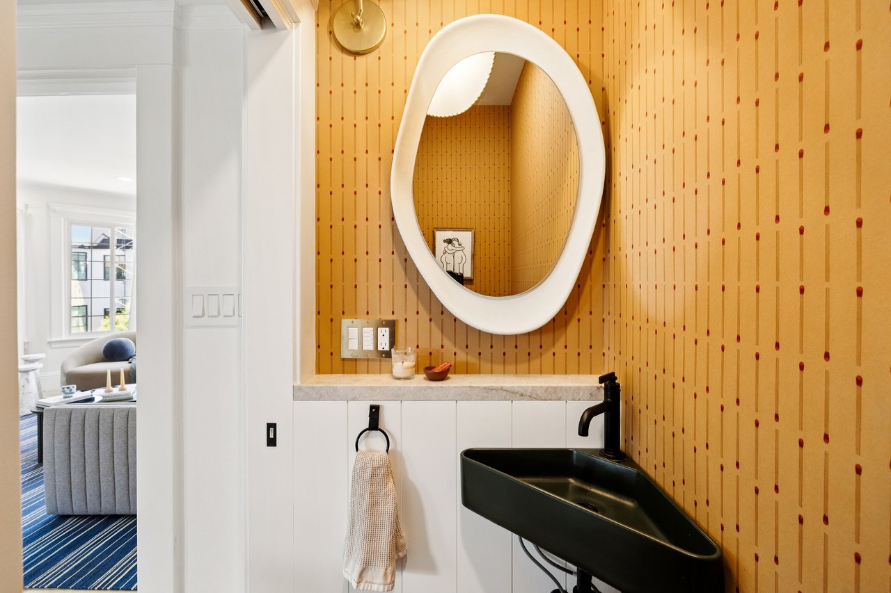 Every room tells a story: a kitchen wrapped in Farrow & Ball sage green cabinetry and Taj Mahal quartzite with a built-in banquette upholstered in custom designed fabric; a living room bathed in natural light; a powder room with a sculptural concrete sink and organic mirror from Lulu and George; and a primary bath with hand-laid mosaic tile floors and a cleverly ceiling-mounted arched mirror. Hardware by Rejuvenation, plumbing by Kohler, window treatments by The Shade Store – the sourcing list reads like a design editor's wish list.